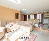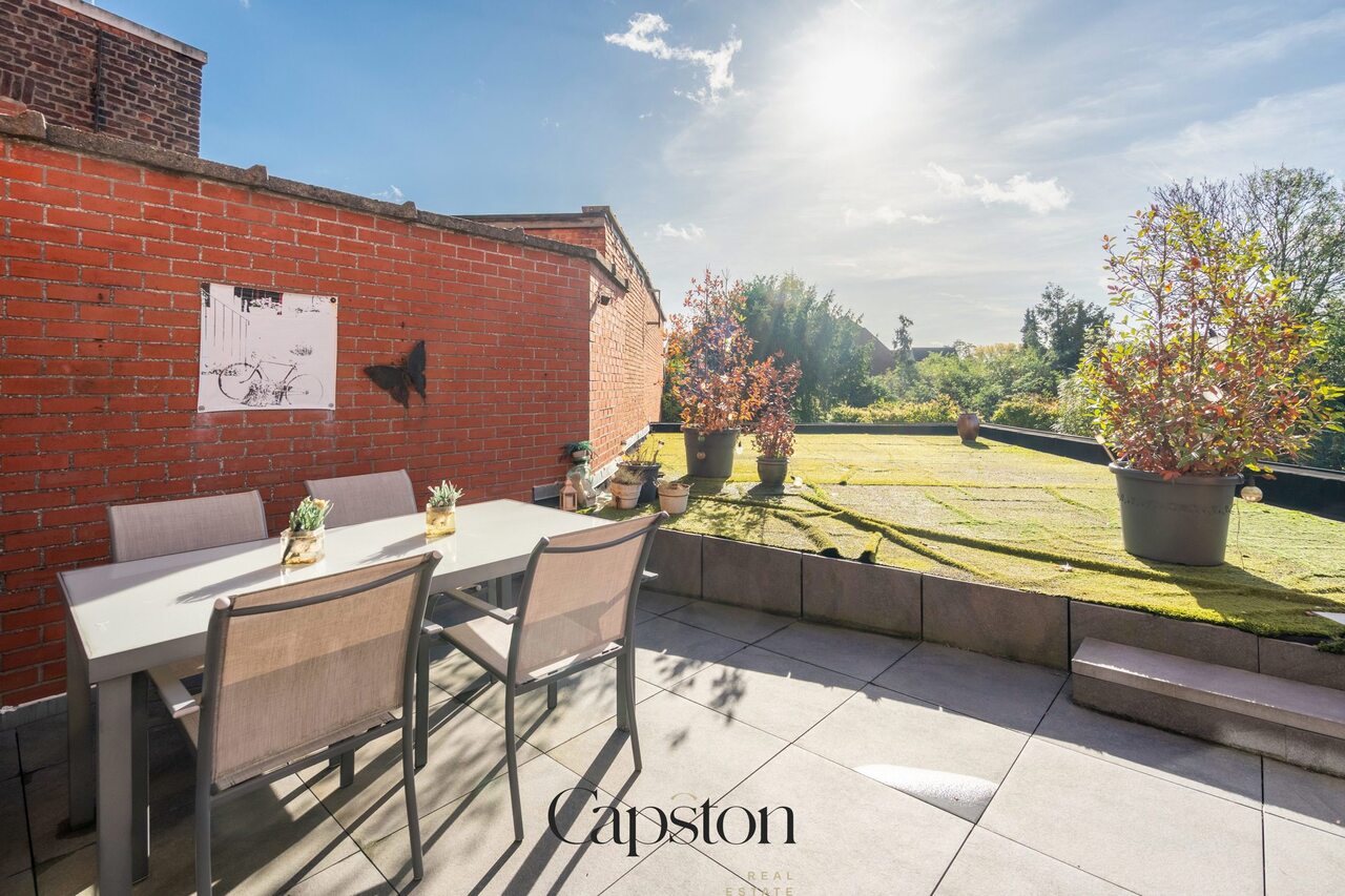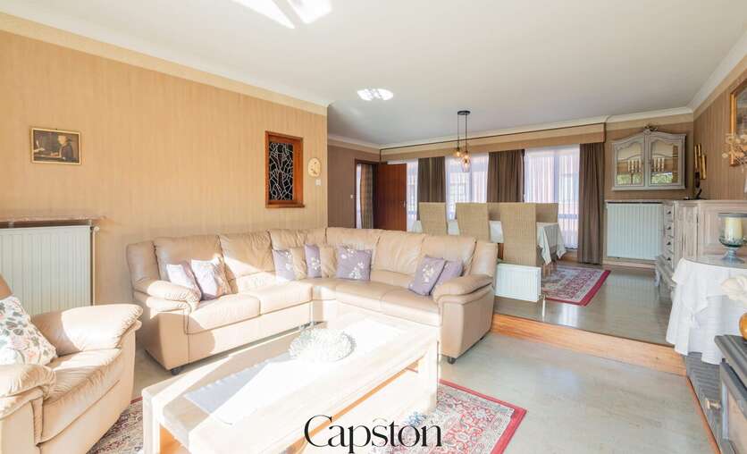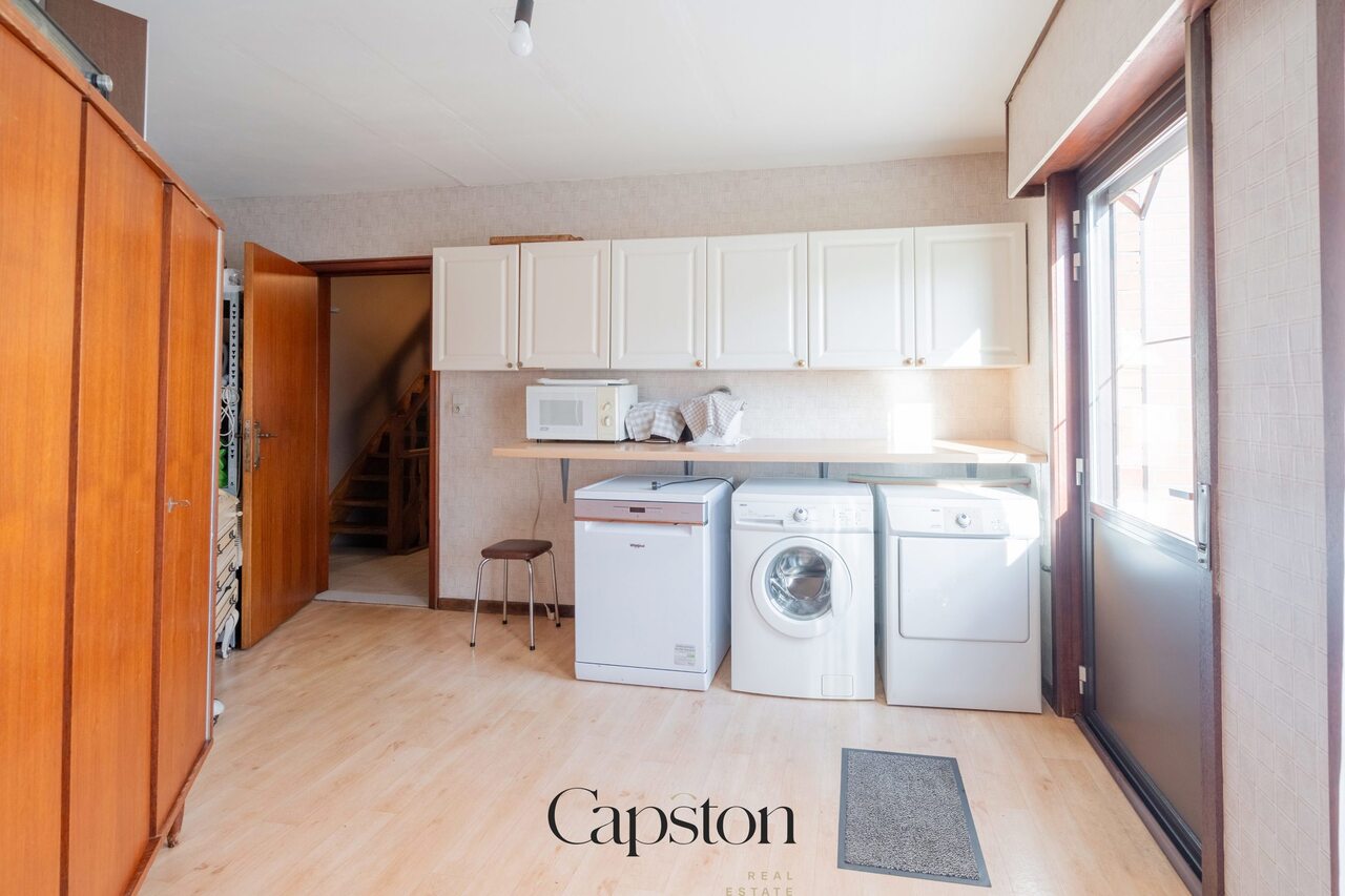Op de eerste verdieping bevindt zich een lichtrijke en ruime leefruimte met een verzonken salon en ingebouwde haard. Vanuit de leefruimte is er toegang tot het zonnige terras. De aparte keuken is volledig uitgerust met alle toestellen. Daarnaast is er een ruime berging/wasplaats met aansluiting voor wasmachine en droogkast. Via deze berging is er eveneens toegang tot het terras.