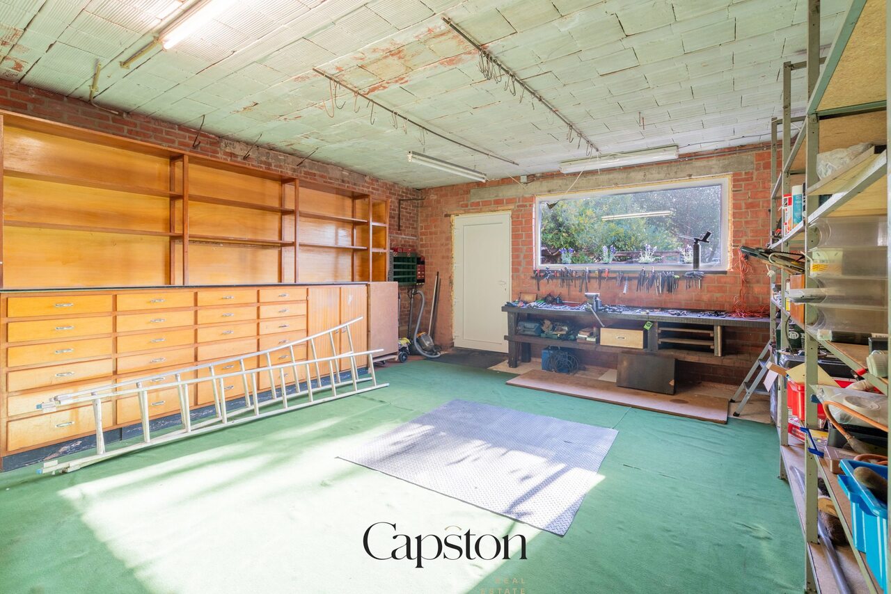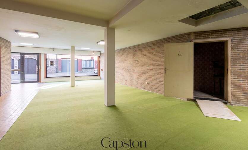 Op het gelijkvloers bevindt zich een ruime showroom (polyvalente ruimte) met een etalage over de volledige breedte. Achteraan is er een apart werkhuis/atelier. Een aparte gang biedt rechtstreekse toegang tot de straatzijde.
