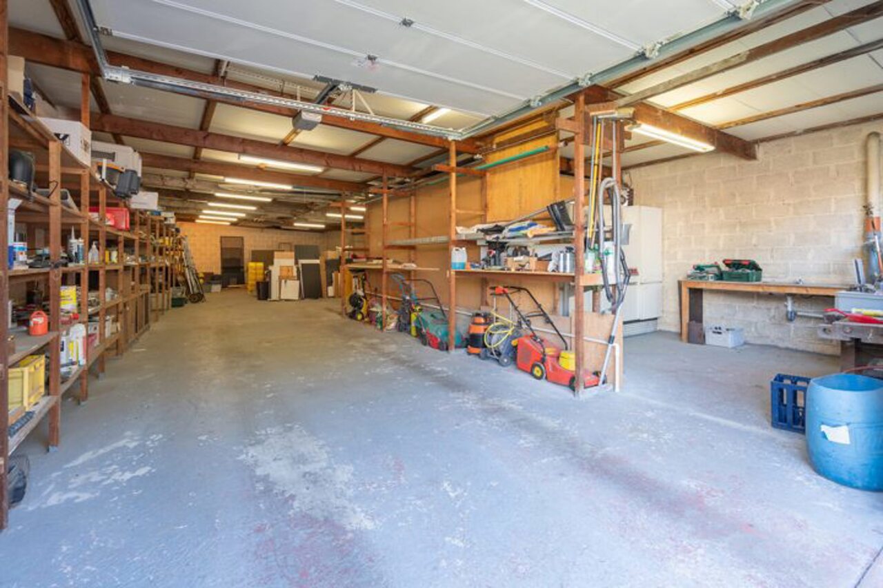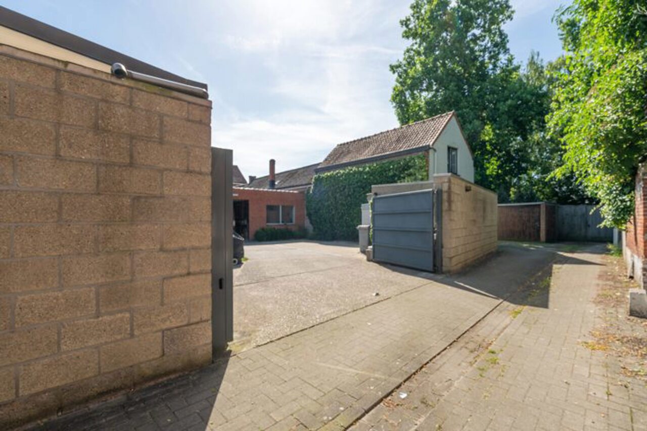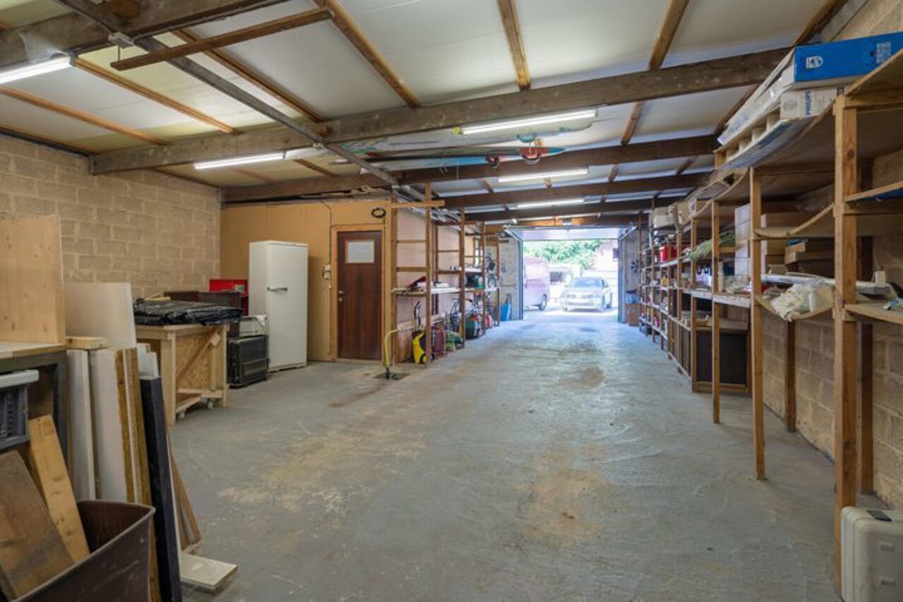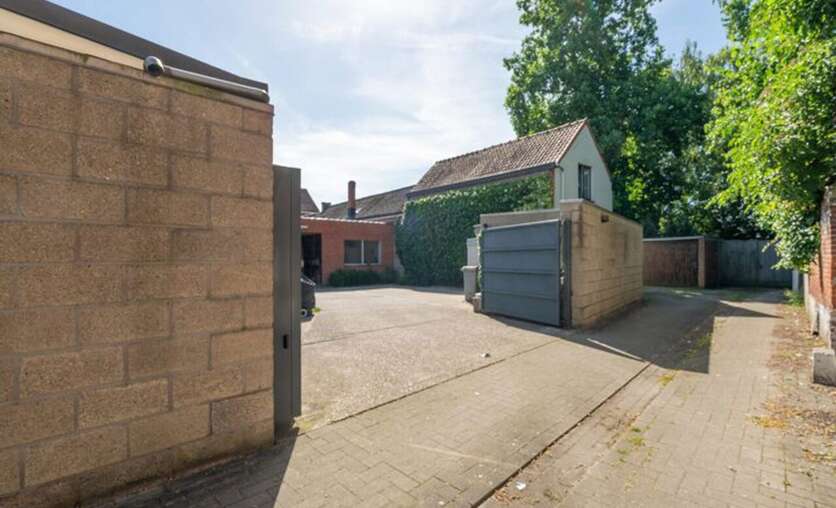 Via een brede toegangspoort bereik je het multifunctionele magazijn van ca. 200 m², ideaal voor opslag of andere activiteiten.