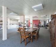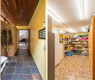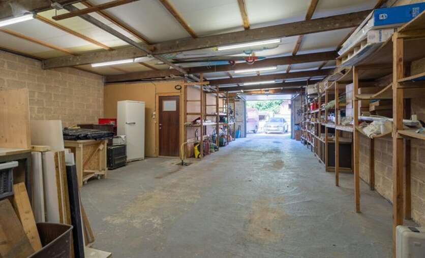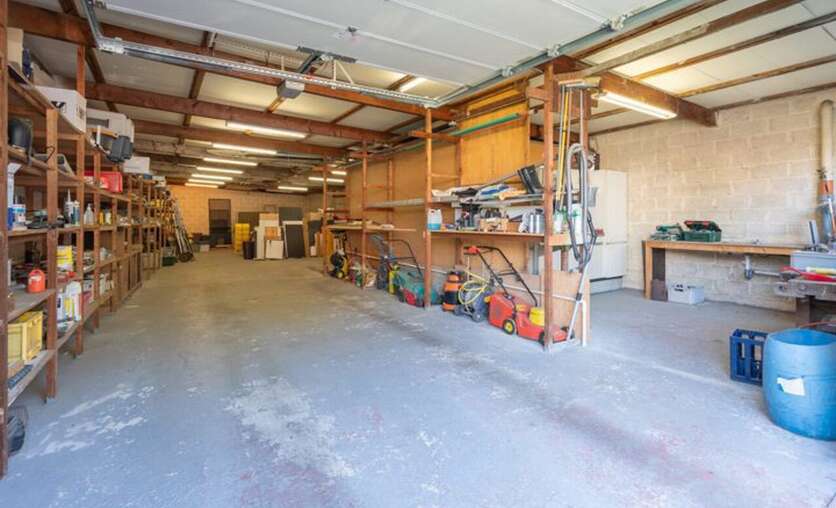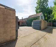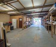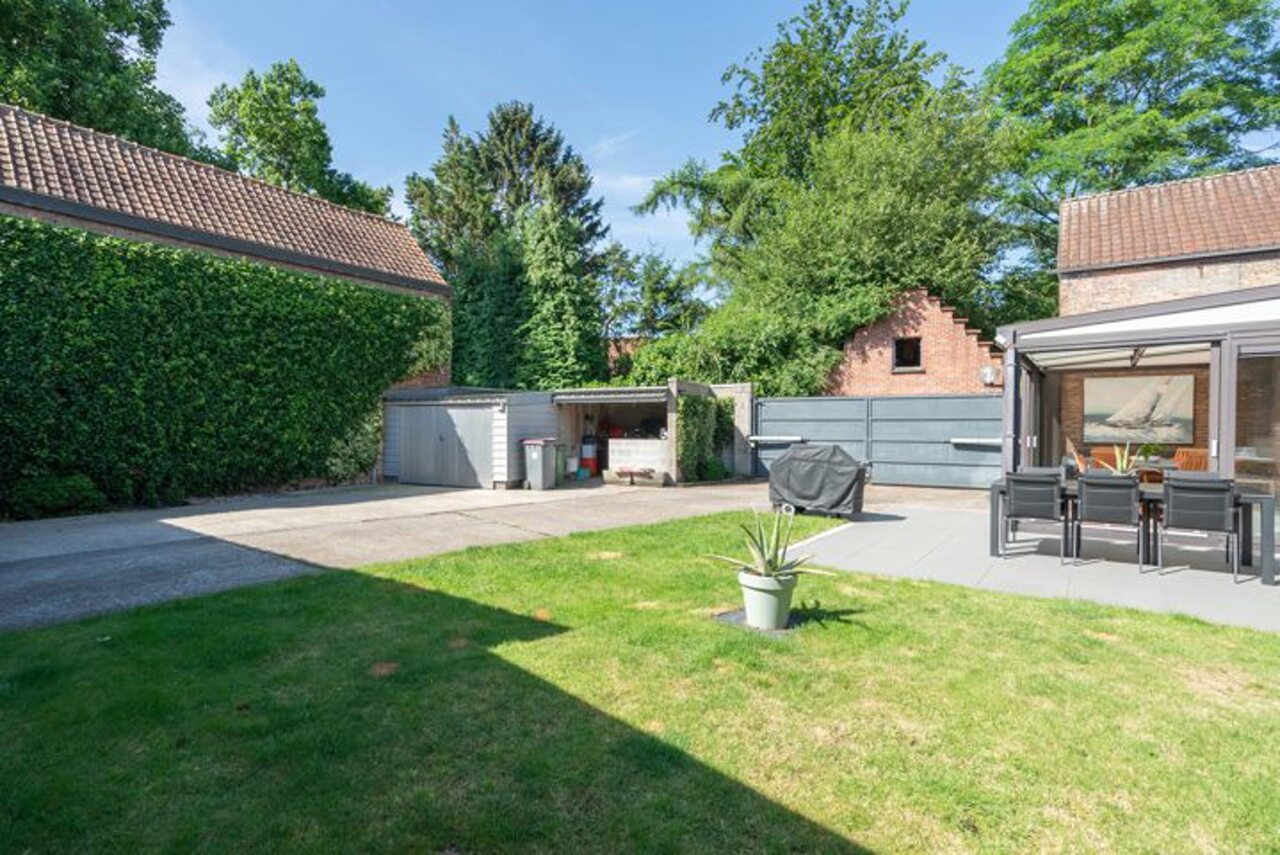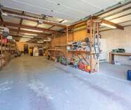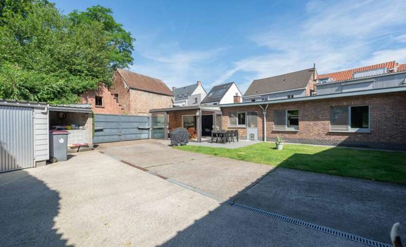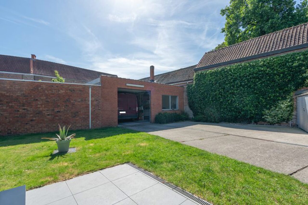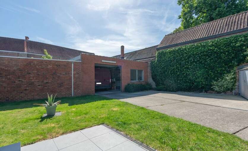 Via een brede toegangspoort bereik je het multifunctionele magazijn van ca. 200 m², ideaal voor opslag of andere activiteiten.